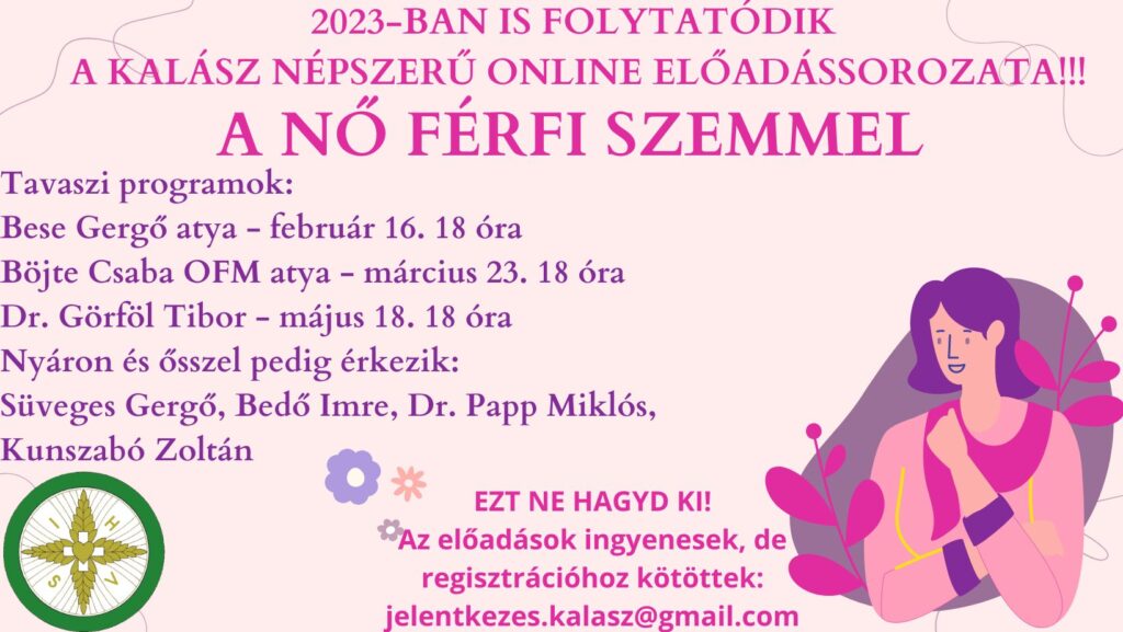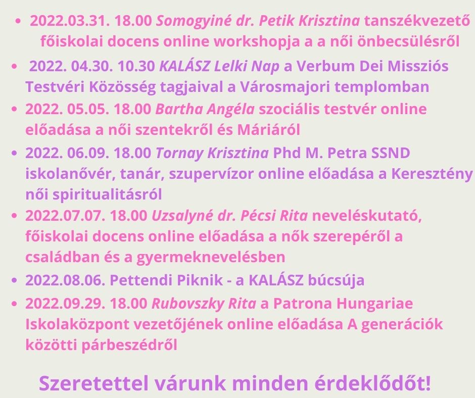 A KALÁSZ küldetése a lányokat és asszonyokat segíteni abban, hogy a katolikus hit alapján tudják betölteni a sajátos női hivatásukat a társadalomban, az egyházban és a családban. Ezt a küldetést szem előtt tartva egy rendkívül változatos és izgalmas tematikájú online beszélgetés-sorozatot állítottunk össze, neves szakemberek meghívásával, amire szeretettel hívjuk minden érdeklődő nőtársunkat. Továbbá a program-sorozat része egy lelki nap is áprilisban, személyes jelenléttel.