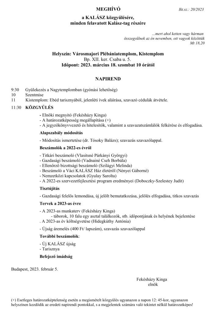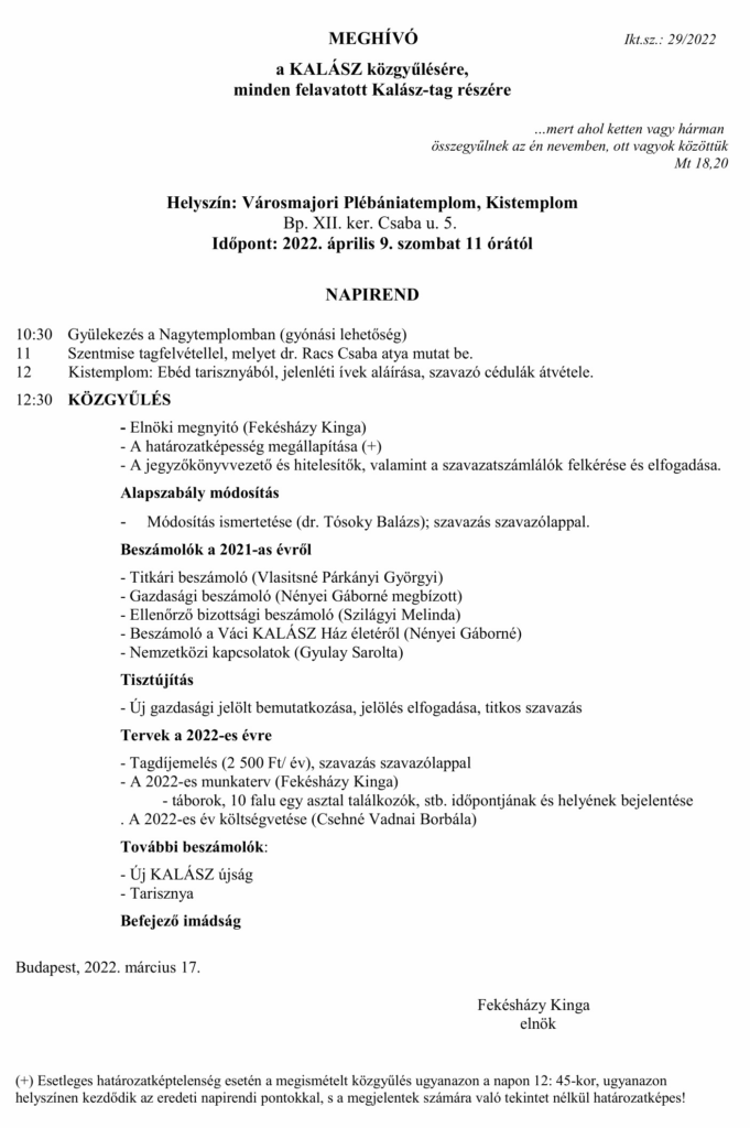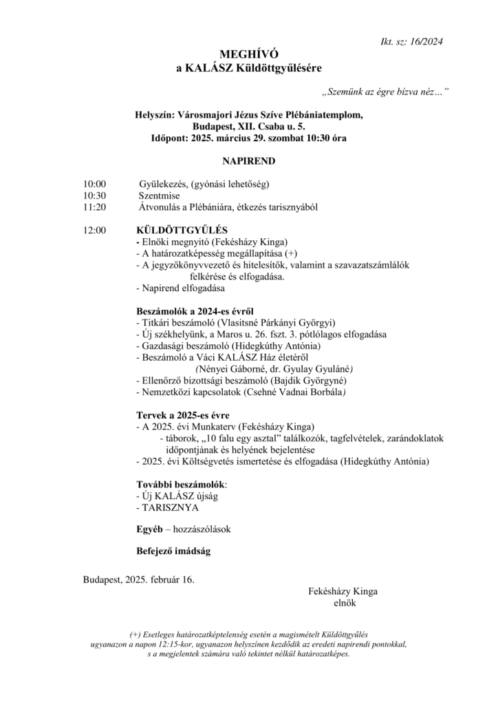 a KALÁSZ Szövetség 5 évenkénti rendes tisztújító közgyűlésére