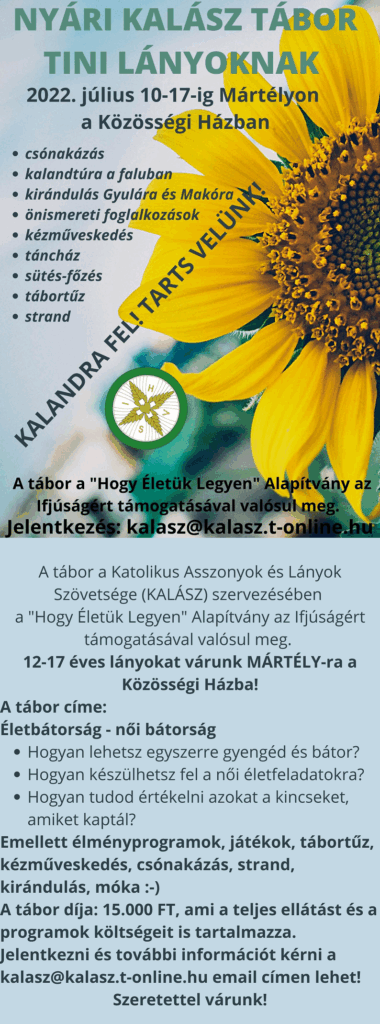 Október 22 és 24 között Mártélyon került megrendezésre a KALÁSZ őszi lánytábora. Szolnokról, Szegedről, Hódmezővásárhelyről és Mártélyról érkeztek kamasz lányok a programunkra, összesen nyolcan.