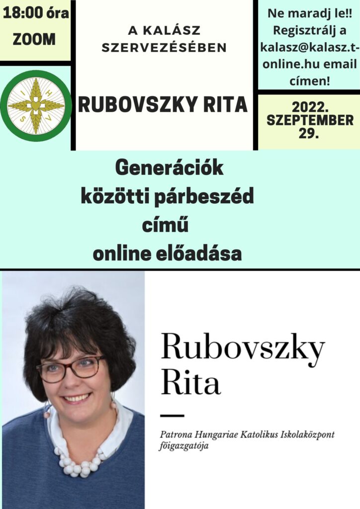 2022. szeptember 29. 18 óra Rubovszky Rita a Patrona Hungariae Iskolaközpont vezetője, online előadás és beszélgetés a generációk közötti párbeszédről
