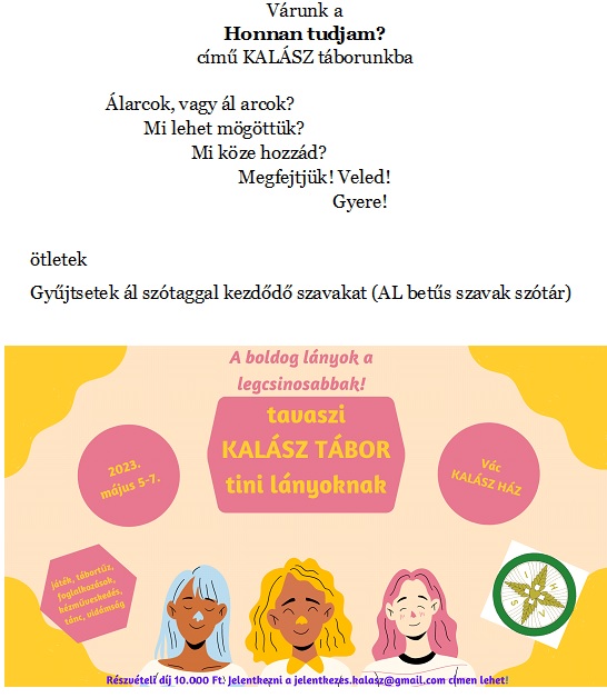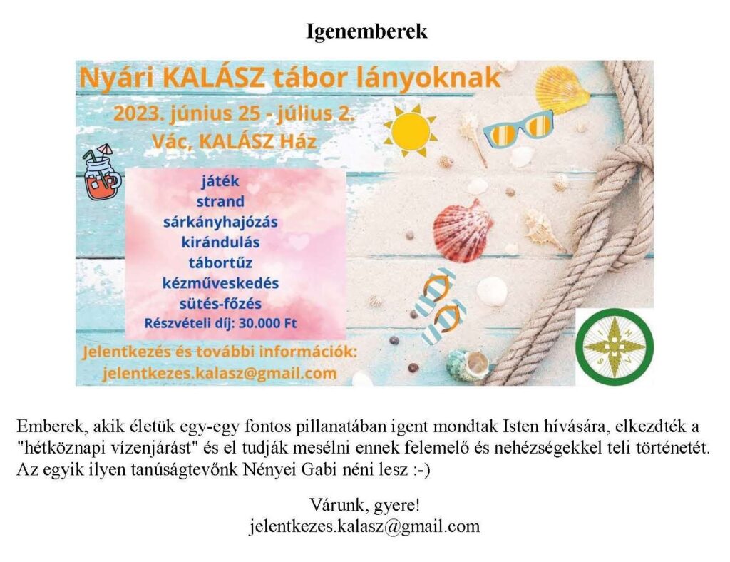 Költség: Várhatóan 15 000 Ft kiadás jut egy főre, mely összeg a tábor kezdetekor fizetendő. Senki se maradjon távol anyagi okokból! Összefogással mindent meg lehet oldani! Többlet befizetést ennek érdekében köszönettel elfogadunk.